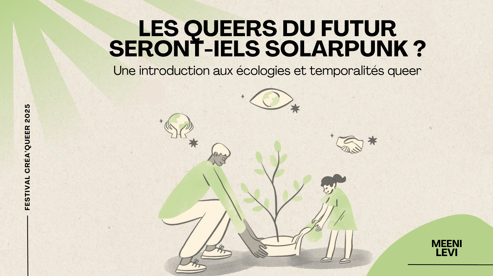 Cette présentation a été donnée dans le cadre de l’édition 2025 du festival Créa’Queer. Elle introduit les concepts de solarpunk, de temporalités queers et d’écologies queers. Le solarpunk est un genre artistique et littéraire, ainsi qu’un mouvement social. Il est caractérisé par une imagination futuriste et utopiste avec comme éléments